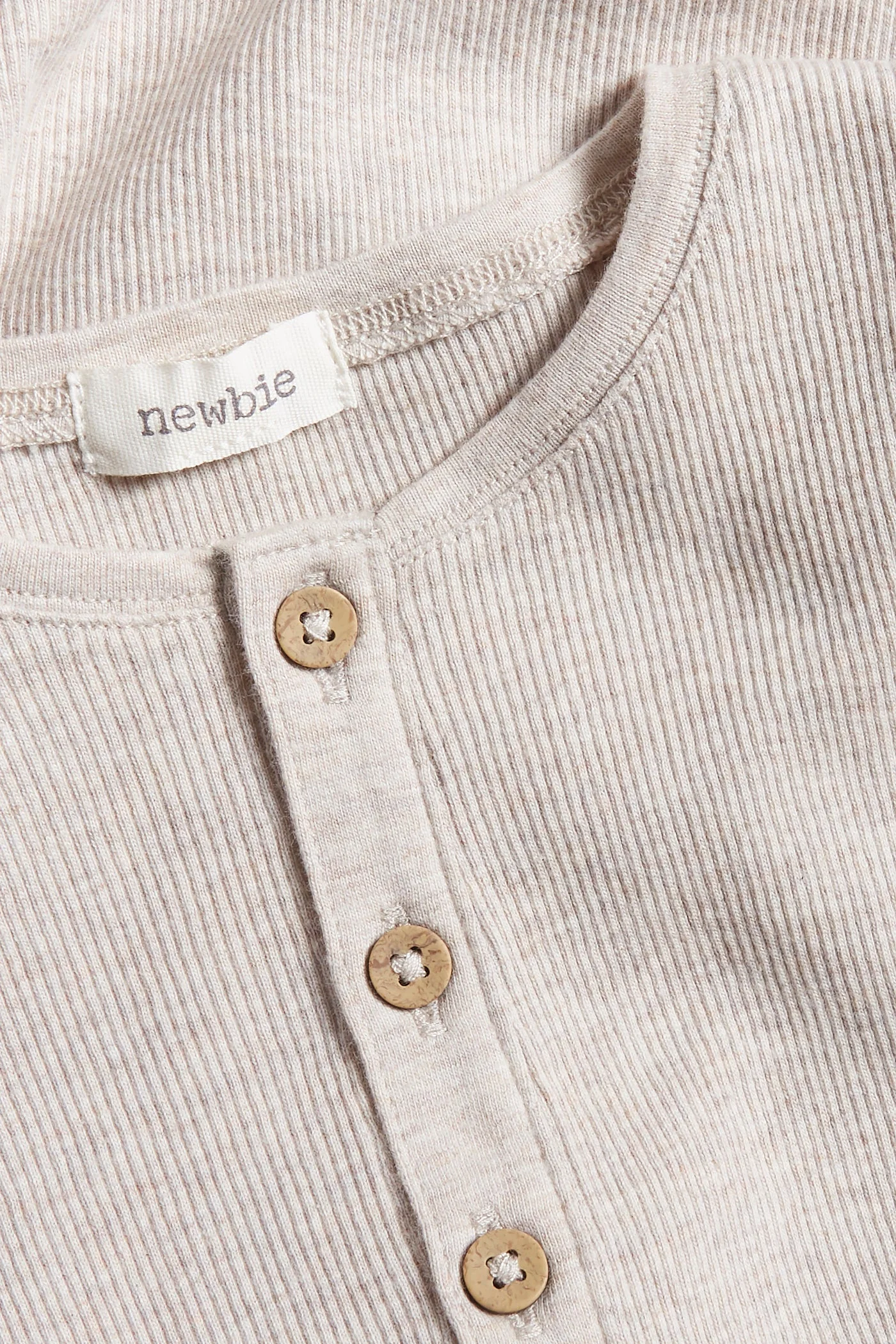 Ribbed long sleeve basic bodysuit with grandfather button front. Features convenient press buttons in the crotch for easy dressing. Crafted from organic cotton, this baby bodysuit includes a sewn-on Newbie logo at the bottom for a touch of charm.